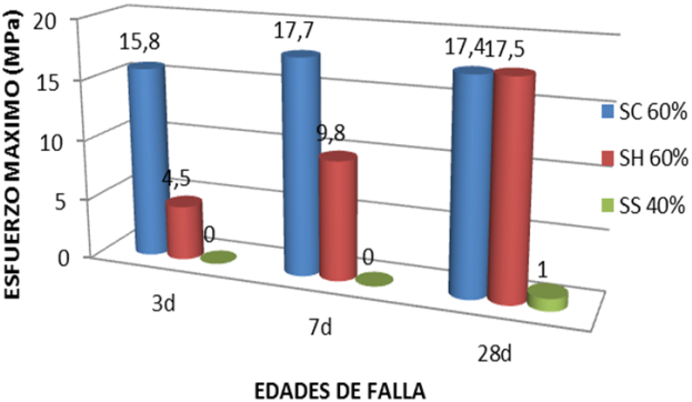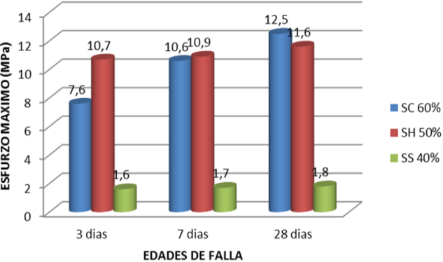 Las pastas con mejor comportamiento a la compresión son las Na2SiO3/Na2CO3 (SC) al 60% (Fig. 6), presentando un aumento progresivo en su resistencia, mientras la relación SH presenta una disminución en la resistencia con un valor aproximadamente de 11,6 Mpa.