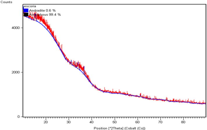 La escoria con la cual se trabajaba estaba compuesta principalmente de CaO y SiO2. La escoria presentaba una estructura amorfa casi en su totalidad, la fase cristalina presente en la escoria sin activar es Gelenite y en la escoria activada con Na2SiO3/NaOH fue de andradita, el cual es un mineral del grupo de silicatos esto gracias a la reacción de activación.