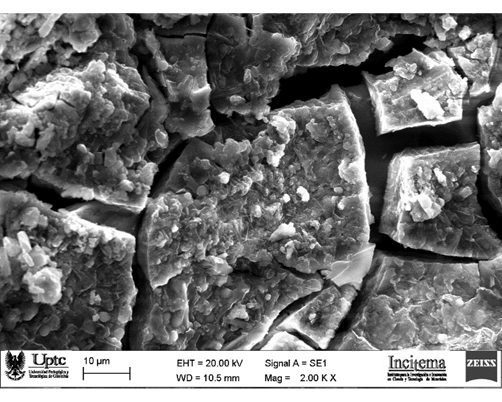 Según la Fig. 10 la escoria tiene partículas irregulares y muy afiladas, en cambio la arena muestra una morfología esférica. Las partículas al disolverse forman una matriz que contiene los productos de reacción y continuan en la superficie aquellas partículas que no se disolvieron, formando anillos de reacción en estado sólido alrededor de ellas. De manera general, podemos observar que no aparece porosidad, pero si se detalla la presencia de grietas probablemente creadas por el vacío experimentado dentro de la cámara del microscopio.