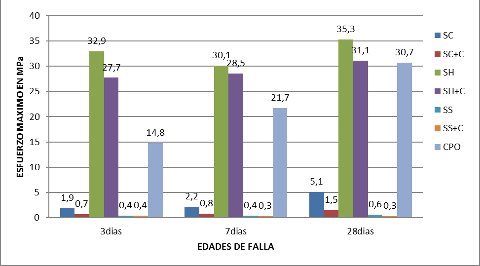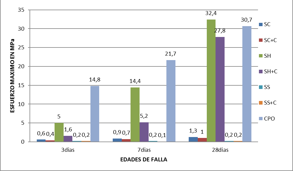 Las pastas SC presentaron resistencias de hasta 21 MPa a los 3 días con un porcentaje de activador del 40%, pero como se evidencia en la Tabla VII esta resistencia decae a los 7 y 28 días con tendencia a continuar disminuyendo. Las pastas de Na2SiO3/NaOH (SH) presentaron su mejor comportamiento cuando el porcentaje de activador fue del 50%, y las pastas de Na2SiO3 (SS) tienen un comportamiento similar a las pastas curadas a temperatura ambiente.