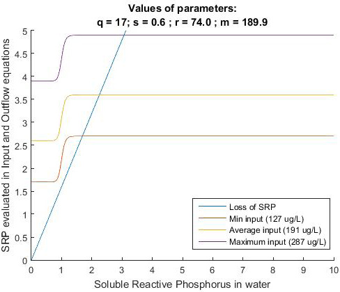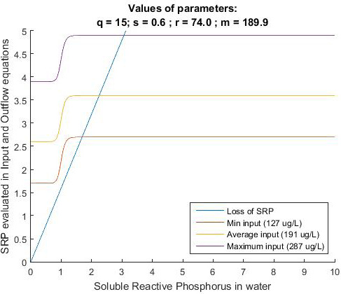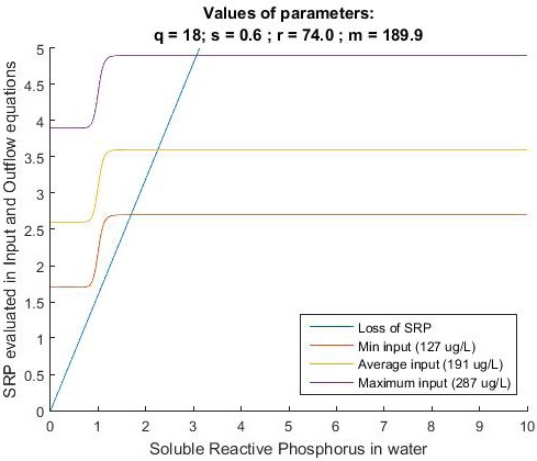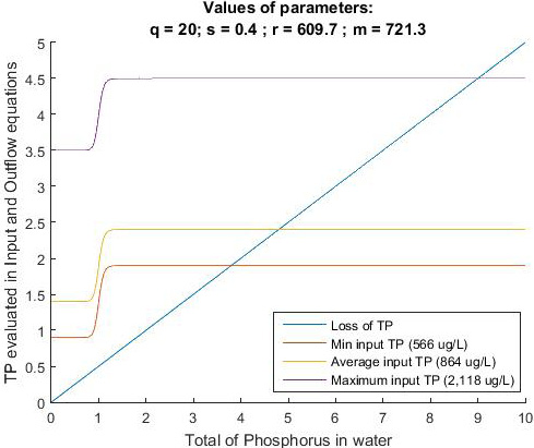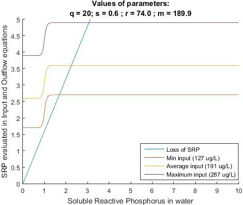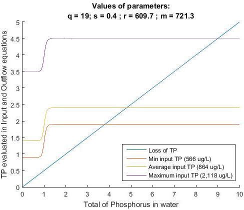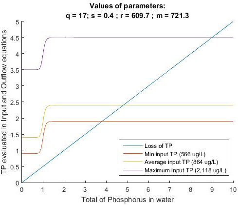 In Fig. 2 and Fig. 3, external phosphorus input is plotted three times, simulating the input of phosphorus using the maximum, average and minimum value for SRP (or TP) in LC. In both figures, it can be observed that while the curve that represents the total load of phosphorus (SRP and TP) decreases, the linear function of the loss is always below the phosphorus input curve (i.e., for any value of SRP or TP). In addition, even when using the minimum SRP value recorded and LC in LC, the function for loss is below of the input function. As the function of loss is always below the function of input, the equilibrium point is eutrophic. From these results, we can infer that reducing the external input of phosphorus into the wetland is not enough to move the state of LC from eutrophic to mesotrophic or oligotrophic. Instead, the equilibrium point (i.e., intersection point between the two functions) is always in the eutrophic region.