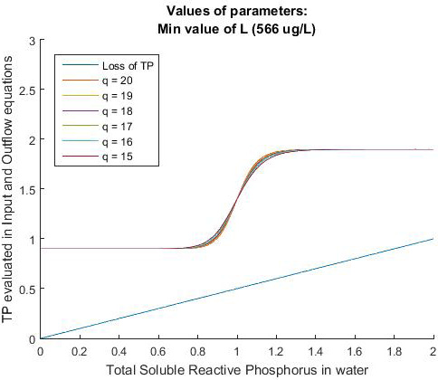 Fig. 2, presents data from the simulation model for phosphorus in LC, using SRP. Fig. 3, presents data from the simulation model for phosphorus in LC, using TP. Analysis for the simulation using q = 19 to q = 15 for SRP and TP are shown in the Appendix.