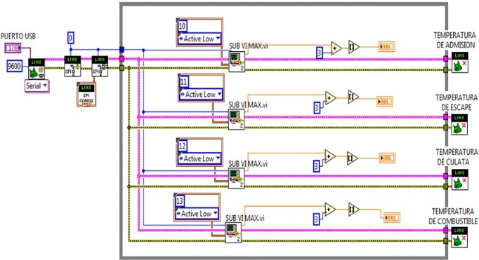 Introduction− Given the research potential currently presented by internal combustion engines, a complete characterization of their operating conditions requires taking into account the variety of sensors used to measure their physical magnitudes, the multiple electronic devices used for the conditioning of signals and the standards that define the communication syntax and synchronization. For this reason, it is necessary to develop software as a link between the instrumentation system and the user, to provide real-time visualization and storage of information.