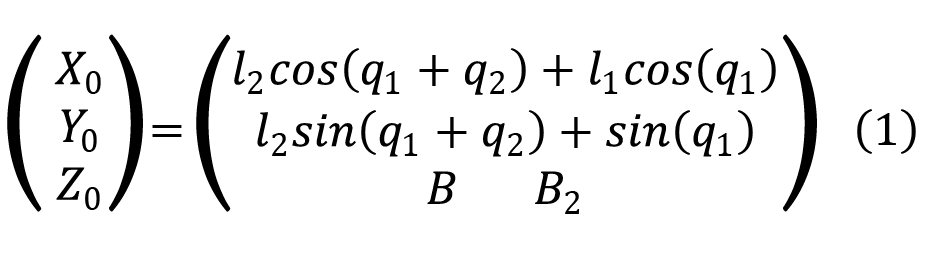 El estudio de la posición, velocidad y aceleración que presenta el sistema se realiza utilizando la teoría de cinemática de manipuladores, en esta se calculan las matrices homogéneas que permitirán describir la cinemática directa de la pierna (1) considerando los parámetros del algoritmo de Denavit-Hartenberg definidos en la Tabla 2 y mostrados en el robot de dos grados de libertad de la Fig. 3.