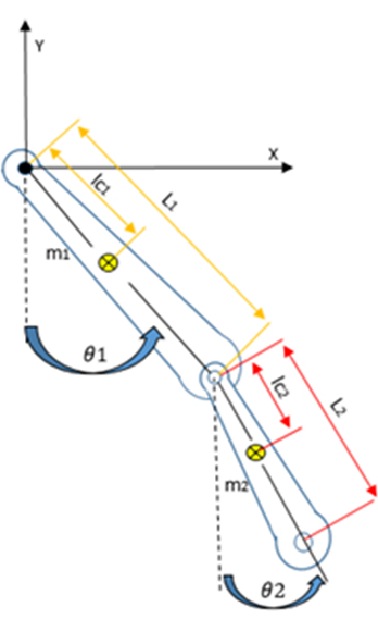 Es posible realizar el análisis de la pierna humana considerando el sistema de doble péndulo invertido como un mecanismo de dos grados de libertad integrado entre sí mediante una sola articulación; teniendo en cuenta que el comportamiento del péndulo invertido y el miembro inferior son semejantes siempre y cuando se conserve las restricciones anatómicas de rotación, se considera el sistema inicial tal como el mostrado en la Fig. ٢, el cual se moverá alrededor de los ejes Y٠ y Z٠, incluyendo actuadores mecánicos en las articulaciones.