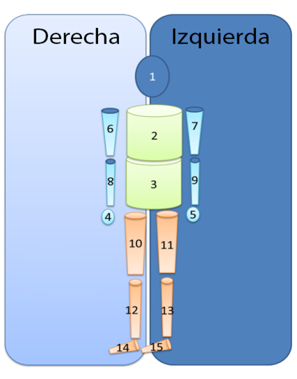 Los parámetros de cada eslabón se incluyen en la Tabla 3, de acuerdo a la Fig. 4. Cada uno de los parámetros fueron calculados considerando el modelo de Hanavan, el cual considera al cuerpo divido en secciones tal como se muestra en la Fig. 5. Y el modelo de Drillis y Contini, el cual describe entre otras, la longitud de los segmentos del cuerpo humano.