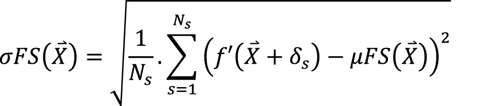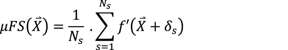 donde δs es la perturbación de variables y parámetros en el escenario 𝑠, y 𝐹𝑠 (𝑋⃗) es el valor objetivo asociado al muestreo 𝑠 de Monte Carlo. Por lo tanto, un valor promedio esperado para una solución dada sobre el conjunto de escenarios considerados se puede calcular como:
