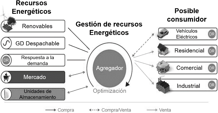 Este problema considera un intermediario distribuidor de energía (de ahora en adelante agregador), el cual tiene las siguientes roles: