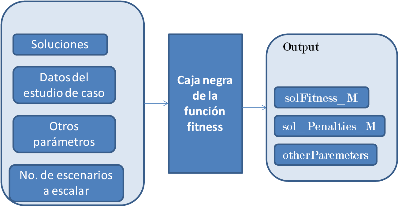 Los organizadores diseñaron esta función como una caja negra que se representa en la Fig. 3(a). 𝑓' es una función encriptada que recibe como argumento de entrada una matriz con las soluciones, la información del estudio de caso, algunos parámetros adicionales y el número de escenarios que el competidor desea evaluar, para la competencia, se consideraron un máximo de 100 escenarios.
