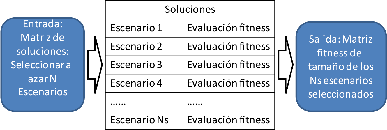 La Fig. 3 (b) muestra el funcionamiento interno de 𝑓', que selecciona aleatoriamente 𝑁𝑒𝑣𝑎𝑙𝑆 escenarios (𝑁𝑒𝑣𝑎𝑙𝑆 es un parámetro especificado por el usuario) de los 𝑁𝑠 disponibles. Observe en esta figura que el número real de evaluaciones de la función depende del tamaño de la población a evaluar y de la cantidad de escenarios que el competidor desea considerar cada vez que se llama la función. El número de evaluaciones de funciones es, por lo tanto: