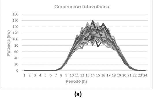 La potencia generada para cada generador se presenta en la Fig. 6. La generación de energía fotovoltaica se representa en la Fig. 7 por una curva que se mantiene en 0 durante las primeras 7 horas iniciando con una generación de energía desde los 6 kW con un suave incremento hasta los 126 kW, cae hasta un fondo alrededor de 87 kW a las 15 horas, seguido de un máximo alrededor de 116 kW y finaliza con un descenso escalonado hasta 0 kW.