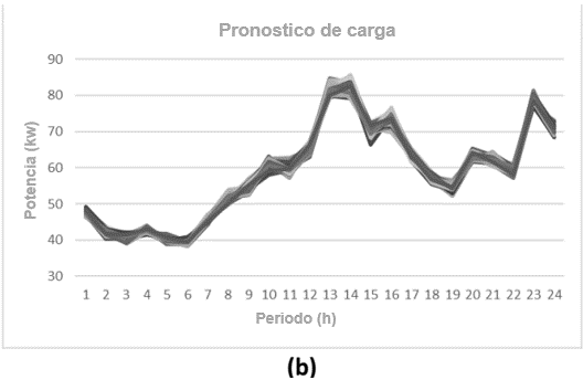 La operación en conjunto de las 5 unidades de despacho, un generador de energía fotovoltaica y un proveedor externo muestran la curva de generación de energía para un día típico (ver Fig. 8), los generadores del 1 al 6 varían sus conexiones para generar la carga alrededor de los 20 kW que se mantiene con pequeñas variaciones durante las primeras 8 horas seguido de un incremento escalonado hasta la hora 14, después de bajar levemente hasta el fondo en la hora 15, llega a su máximo ascenso de 103,8 kW a la hora 17 y cae levemente hasta un valor un poco sobre 20 kW en las 24 horas.