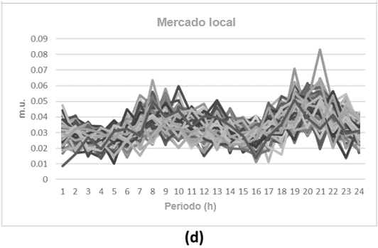 El número de escenarios se redujo a 100, utilizando técnicas de reducción especializadas. En cuanto a los viajes de los vehículos eléctricos, se generan aleatoriamente 100 diferentes pronósticos de programación para cada escenario. La Fig. 4, ilustra los escenarios generados para la generación fotovoltaica (a), pronóstico de carga (b), mercado mayorista (c) y mercado local (d).