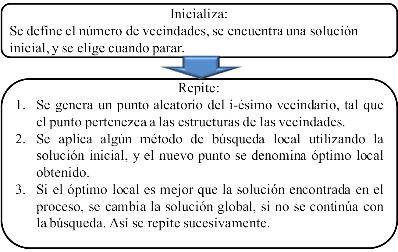 Una estrategia de búsqueda local para la optimización no lineal es capaz de encontrar un óptimo local de un problema que presenta muchas buenas soluciones de calidad. La estrategia consiste en extender la búsqueda local para realizar cambios sistemáticos en las vecindades, solucionando problemas complejos. El algoritmo explora vecindades distantes y actualiza la mejor solución. La estructura de funcionamiento del algoritmo tiene dos fases principales: inicio y repetición (ver Fig. 5) [14].