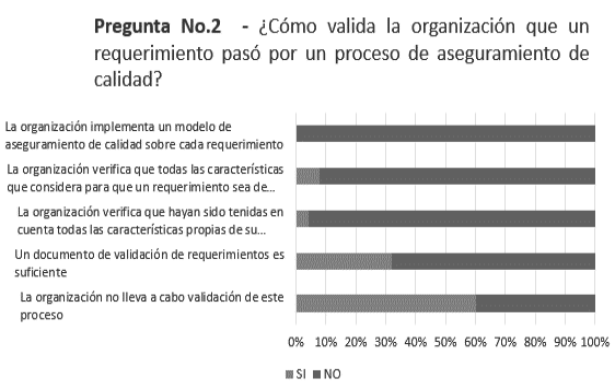 En consonancia, el aseguramiento de la calidad de los requisitos en su aspecto, es un enfoque sistemático para recolectar, organizar y documentar los requisitos del sistema, lo que directamente implica y facilita el acuerdo de cambio o modificación de los requisitos, poniendo en consideración opiniones y decisiones de las partes [19]. Para este caso, a los clientes y equipo del proyecto, que para el 8% de los productores, su actividad de validación determina el buen manejo de este proceso se afirma en tener en cuenta características de calidad en consecuencia de documentar los errores e implicando las buenas prácticas, lo cual serán implementadas en proyectos futuros razón que evitará implicar en cierta medida a las partes para la toma de decisiones.