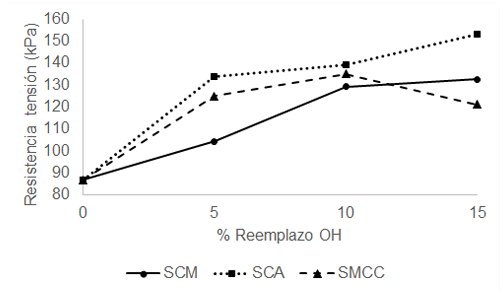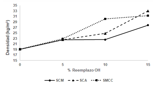 La Fig. 6 presenta la tendencia de los resultados de las muestras ante el incremento del porcentaje de reemplazo de OH en la formulación de la espuma; esta tendencia es similar a la que se presenta en densidad aparente y en parte, a la absorción de agua. De los resultados y el análisis obtenido en el efecto de la densidad aparente, se esperaba que a medida que el porcentaje de reemplazo de OH en las muestras fuera mayor, las propiedades mecánicas se incrementarían y por ende mejorarían. Esto se hace evidente, de forma efectiva en las muestras con incorporación de CM y CA, especialmente, en las muestras con CA que poseen los valores más altos para cada una de las variaciones en el reemplazo, con una resistencia de 152,92 kPa a un porcentaje de reemplazo de 15%.