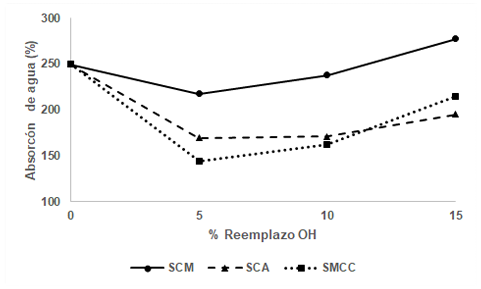 De acuerdo a lo observado en la Fig. 5 se evidencia que inicialmente, la tendencia de las espumas es disminuir su porcentaje de absorción de agua a medida que aumenta el porcentaje de reemplazo de OH por parte de las fibras. En el caso de las muestras con CM, se presenta mayor capacidad de absorción de agua con respecto a las otras fibras, siendo a un porcentaje de reemplazo del 15% un incremento de 277,30% de masa de la muestra.