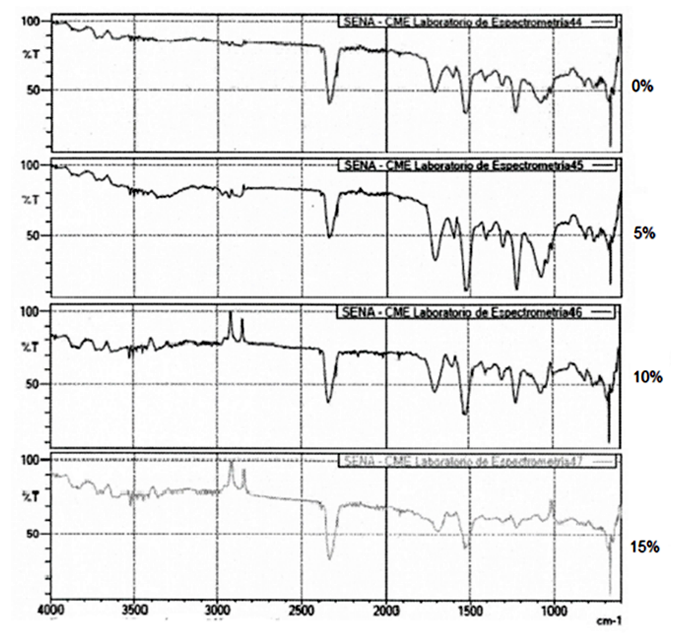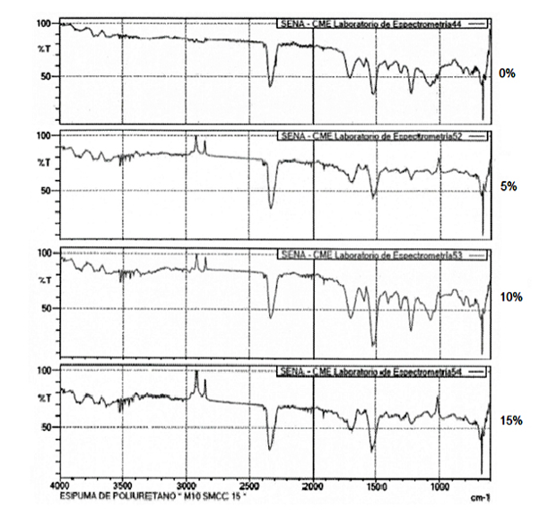 Los espectros observados en la Fig. 7, Fig. 8 y Fig. 9 son los resultados que se obtuvieron a partir de las muestras con CM, CA y MCC respectivamente, teniendo como referencia la espuma que no contiene incorporación de ningún tipo de fibra. En la zona correspondiente a los 2400-2300 cm-1 se pronuncia un pico perteneciente a enlaces C ≡ C y C ≡ N; la región comprendida entre los 1700-1600 cm-1 evidencia un pico característico de los grupos carbonilo confirmando la formación de grupos uretano; entre 1600-1500 cm-1 se forma un pico intermedio generado por la vibración de los enlaces C = C de los anillos del MDI. Entre 1300-1000 cm-1 se presentan unos picos medianos correspondientes a los grupos aromáticos del MDI.