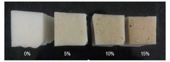 Luego de desmoldar y cortar las espumas se observa el tamaño y la homogeneidad de las celdas. Las espumas con incorporación de CM, como se observa en la Fig. 1, presentan una estructura casi uniforme y una buena dispersión de las fibras; se pueden observar en las muestras de 10% y 15% algunos espacios de aire que quedaron atrapados durante las etapas de mezclado y crecimiento. Adicionalmente, se observa que, a mayor concentración de cáscara de mango, el color de las espumas es más café caramelo.