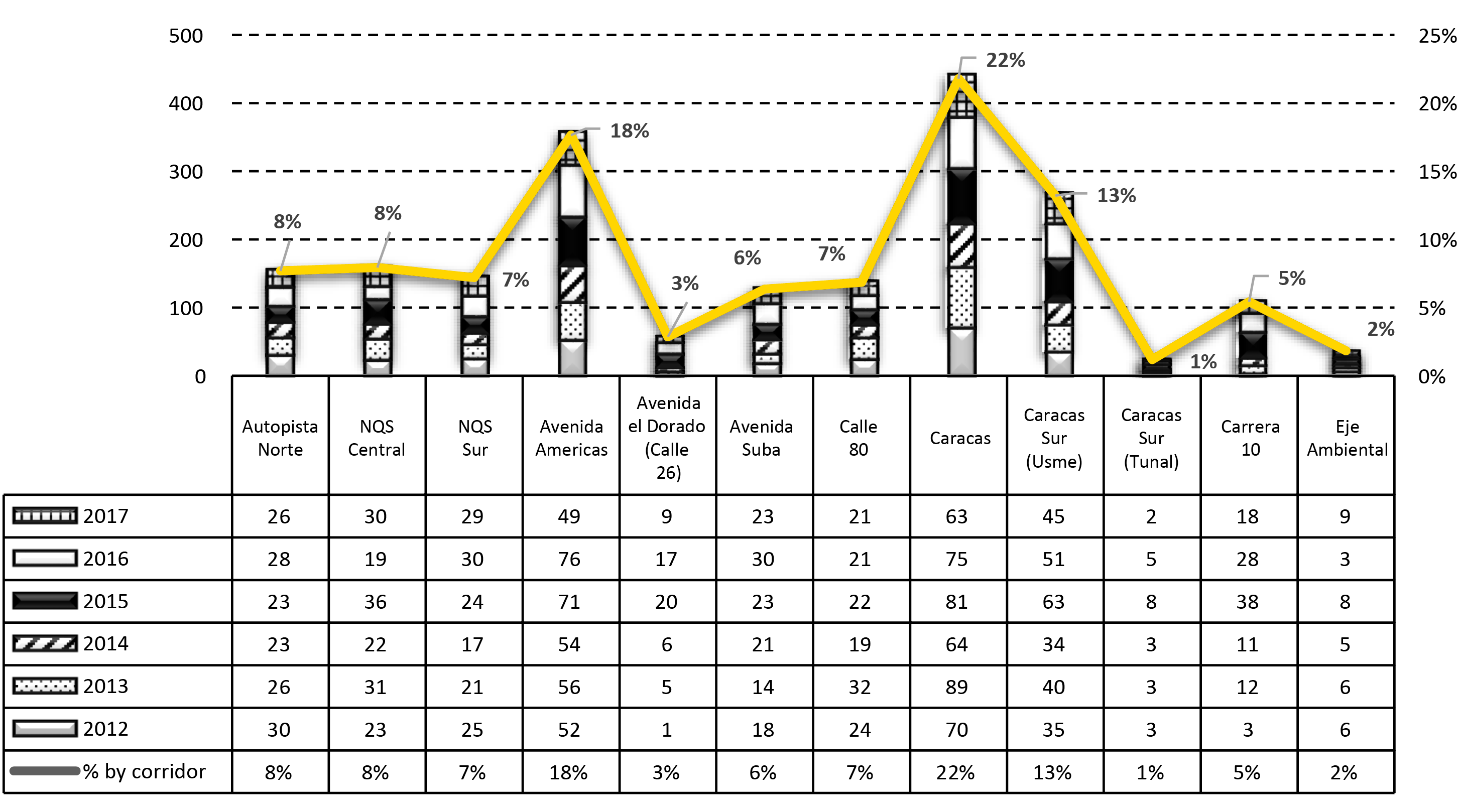 The crash data related to the BRT were obtained from the Secretary of Mobility of Bogotá corresponding to the years 2012 to 2016 with the following information: Accidents by time of occurrence (year and month), by severity (fatal and non-fatal), vehicle involved in collision with BRT (light, motorcycles, buses, trucks and bicycles), type of victims, age and gender (driver, passenger, pedestrian and cyclist) and location. These characteristics of the crash has been considered in recent road safety studies of the BRT [18], [19], [20]. From this information, an accident analysis was performed by time of occurrence (year and month), corridor, severity, vehicles involved in collision, class (vehicle-pedestrian collisions, vehicle collision, occupant fall and other), by victim (passenger, pedestrian, cyclist and driver) and ages. Fig. 1 shows the total accidents per corridor and it is depicted that the corridor with the highest accident rate is Caracas Avenue (Bogotá, Colombia).
