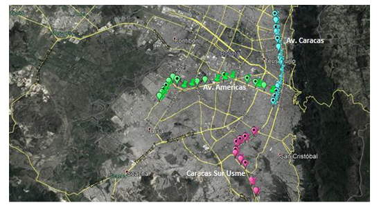 Accidents are also categorized into multiple-vehicles collision, single-vehicle collision and totals (not including those involving pedestrians and / or cyclists). The geometry of the road (e.g. lane width, number of lanes, width of the separator, etc.). Traffic volumes were provided by the Secretary of Mobility of Bogotá for several years and were projected considering the growth of the automotive fleet. Fig. 2 presents the location of the accidents at the most crashes corridors, which are “Caracas Avenue” (cyan marks), “Américas Avenue” (green marks) and “Caracas Sur–Usme” (purple marks).