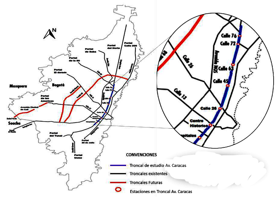 BRT systems are beginning to become an option to meet the needs of urban mobility in large cities. The Bogota’s BRT system (Transmilenio) is integrated by 114.4 Km of roads corresponding to 11 corridors in service, 9 end stations with garage, 139 stations, 41 guaranteed garages, 7454 bus stops, 13 operation zones, 3758 cycle -parking, 4315 charging points and a single collection operator, with a centralized control center [17]. The passenger demand reported for 2015 was 2.213.236 passengers per day.