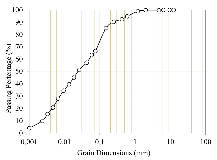 In this research three materials in the first two experimental steps were used: soil, lime, and distilled water. The soil used in this research was collected in the municipality of Fazenda Rio Grande, metropolitan region of Curitiba (Brazil), manually avoiding possible contamination, and sufficient quantity to perform all the tests. The soil is composed, according to the ASTM D2487 [28], of 7.5% of medium sand, 25.9% of fine sand, 57.6% of silt, and 9.3% of clay, as shown in Fig. 1. Table 1 shows the physical properties of the soil, with a plasticity index of 21.3% and a specific gravity of 2.71. According to the Unified Soil Classification System (USCS), the soil is classified as plastic sandy silt (MH). This soil was used previously by Baldovino et al. [4], [31] for soil-lime mixes. The lime used for the study was a dolomitic hydrated lime (CH-III). The CH-III type is one of the most used types of hydrated lime in Brazil. The lime is mainly composed of calcium hydroxide -Ca(OH)2- and magnesium -Mg(OH)2-, produced in the municipality of Almirante Tamandaré (Paraná, Brazil). The retained percentage accumulated in the #200 sieve was 9%, which is in accordance with the Brazilian standard NBR 7175 [32] which specifies that ≤15% of this type of material has to be retained on the #200 sieve. The specific gravity of the lime is 2.39 g/cm3. To perform all the characterization tests for the soil, for the soil-lime mixtures, and for the molding of specimens distilled water at 25 ± 3°C was used to avoid unwanted reactions and limit the number of variables in the study.