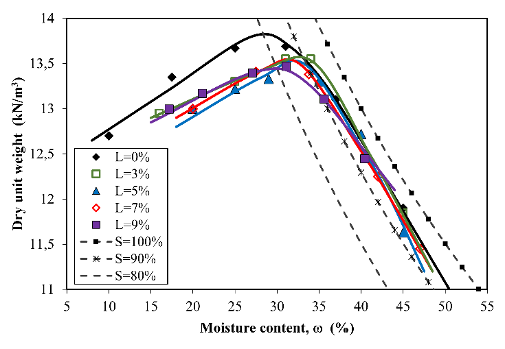 To define the molding points of this research compaction tests were conducted under standard proctor effort for the soil and for the soil-lime mixtures according to the American standard NBR 7182 [33]. Thus, for the silty soil studied in the standard effort, a maximum dry unit weight value of 13.8 kN/m³ and optimal humidity of 31.0% were obtained as shown in Fig. 2. The lime contents used were defined according to the Brazilian experience [3], [4] from 3 to 9% in relation to the dry mass of the soil. Thus, amounts of lime 3, 5, 7, and 9% were chosen as the molding and study contents. Standard effort of compaction was also conducted for each lime content added (L), which is shown in Fig. 2. With the increase in lime content, the apparent maximum dry specific weight decreases while the optimal humidity increased. This behavior is due to the addition of fine materials (lime) and with a lower density (2.39 g/cm3) with reference to the soil (2.72 g/cm3) that filled the voids between the largest particles of silty soil and led to increase the weight of the solids in the volume per unit. Table 2 shows variation for maximum dry specific weight and optimal humidity for the 3%, 5%, 7%, and 9% lime contents. It is observed that the variation is very small due to the low lime contents used. The soil-lime specimens were molded according to the conditions in Table 2, for the curing times of 30, 90, and 180 days.