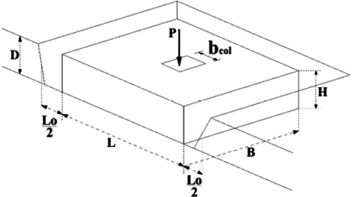 For the design of isolated footings as to the geotechnical aspect, two requirements must be met: achieving the base safety factor and not exceeding the permissible settlement value. Fig. 3 shows the general dimensions of an isolated footing: with width L, length B, footing thickness H, height from footing base to ground level D, excavation width Lo + L, excavation length Bo, and column width bcol (assumed as square).
