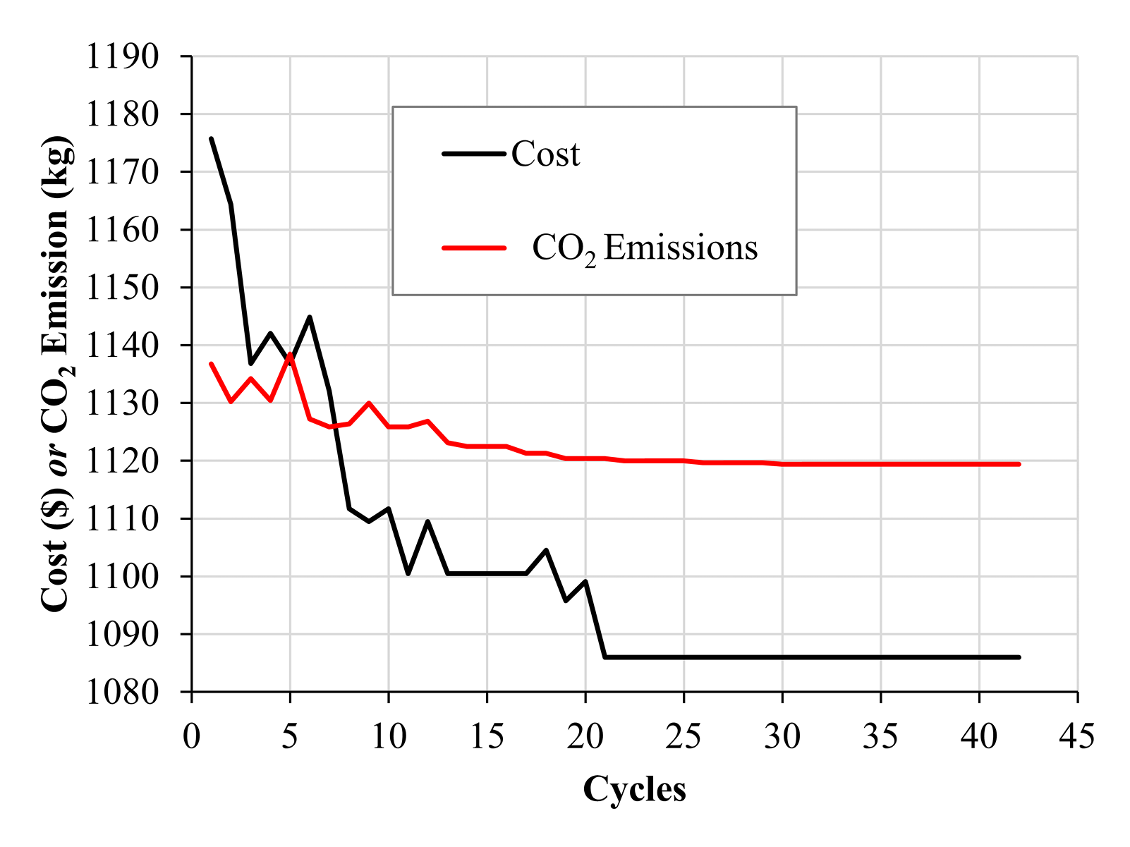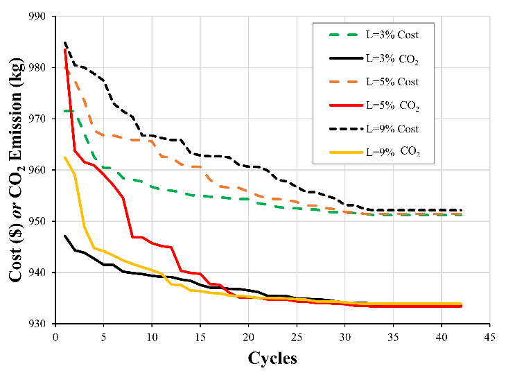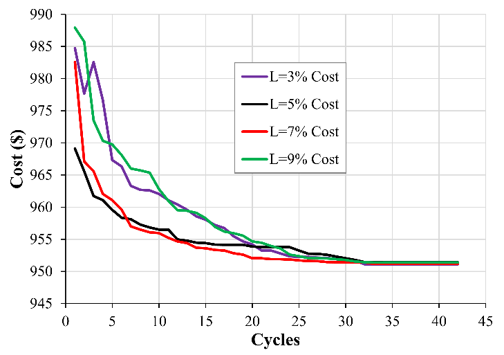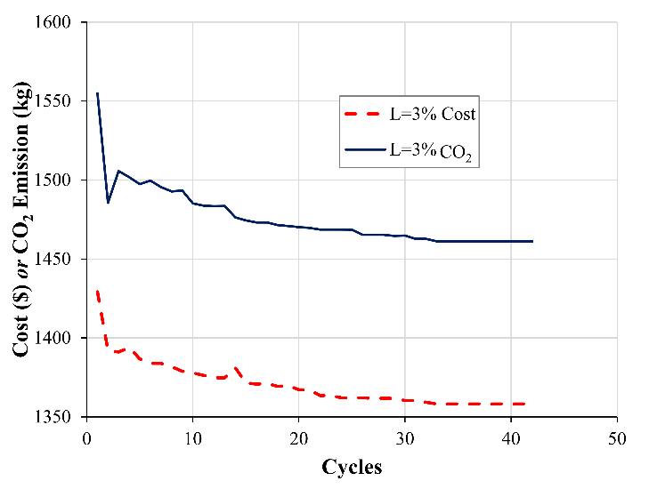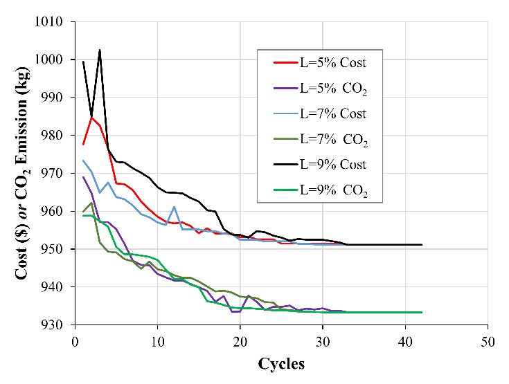 Table 11 shows the results of the designs of footings supported over soil-lime cured for 180 days. It is noted that for all the optimizations and for all the lime contents of 3.5 and 9% the results converged. The cost optimization values were US$951.20, US$951.43, and US$951.13 for 3, 5, and 9% lime, respectively. For 7% lime, a result of US$1,669.23 for cost was obtained. The convergence of the designs for 3, 5, and 9% lime and 180 days of curing time are shown in Fig. 9. It is noted that after 35 cycles the results for the cost and CO2 functions converge on the same result. While the convergence of the designs for 7% lime optimizing cost and CO2 are shown in Fig. 10. For the 1,000 runs made for 180 days of curing time, the results of 7% lime did not converge with the results of 3, 5, and 9% lime, and the optimization values of 7% were higher than those of the other lime contents due to the low cohesion and high friction angle, where the MSAA worked in the limit load capacity and in the maximum settlement of 25 mm.