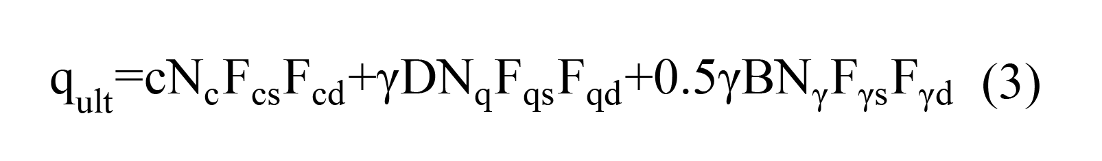 Where γ is the foundation soil specific weight; c is the foundation soil cohesion; Nc, Nq and Nγ are dimensionless bearing capacity factors (being only functions of the foundation soil friction angle – ϕ); Fcs, Fqs and Fγs are shape factors; Fcd, Fqd and Fγd are depth factors, and can be calculated with equations (4)-(16):