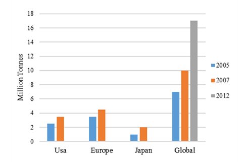 Leading the global context [2] data was collected on tyre generation in North America, Europe and Japan. According to this research, the global generation of scrap tyres up to 2005 was over 2.5 million tonnes in North America, 2.5 million tonnes in Europe and 1.0 million tonnes in Japan [3].