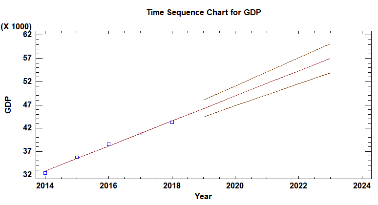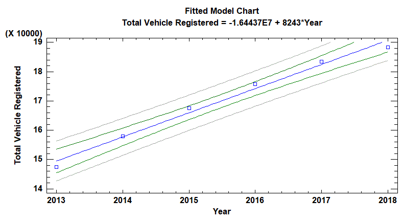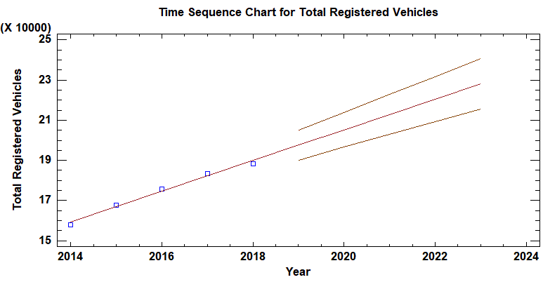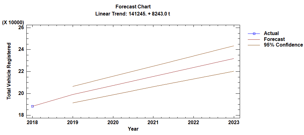 Using the previous model calculated for the correlation: Registered Vehicles = 141245 + 8243.0 X, as well as the historic data as a basis for the estimation; the followed forecast was built for the number of expected vehicles from 2019 to 2023.