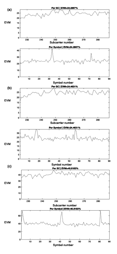 For a pass band of 8 nm the signal is not detectable at all in any of the evaluated modulations. These facts demonstrate that the quality of the signal is reduced, as the slice sizes are broader. In this context, broader slice sizes affect the higher multilevel modulation significantly due to the accumulated chromatic dispersion, which prevent to get a tolerable quality of signal. Such behavior can be observed in Fig. 6 where the EVM per subcarrier and EVM per symbol were measured for the QPSK service transported onto a subcarrier of 3GHz. Fig. 6(a) shows the results for a 1nm optical slice size, Fig. 6(b) depicts the results for an slice size of 3nm and Fig. 6(c) shows the performance for a slice size of 6nm.