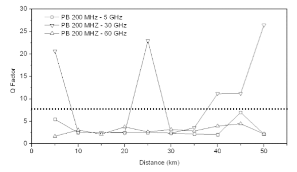 Notice in Fig. 9 the strong degradation of the Q factor when a slice size of 200MHz was used as compared to the result found for a slice size of 100MHz. This fact is due to the pulse broadening effect caused by a broader optical carrier. In this case only the 30GHz subcarrier is able to satisfy the quality of signal limit only at certain transmission distances. This interesting behavior comes from two reasons; the first one is due to the strongly number of harmonic distortion products that are absorbed by the photodetector with a 5GHz subcarrier, whereas the degradation of the 60GHz comes from the bandwidth limitation of the optical modulator used in the simulations. The second reason for such behavior is due to the higher differential group delay generated by the 200MHz optical pass band, which in turn causes the generation of the carrier suppression effect that makes the signal at 30GHz unable to be recovered from 9km to 21km and from 28km to 37km.