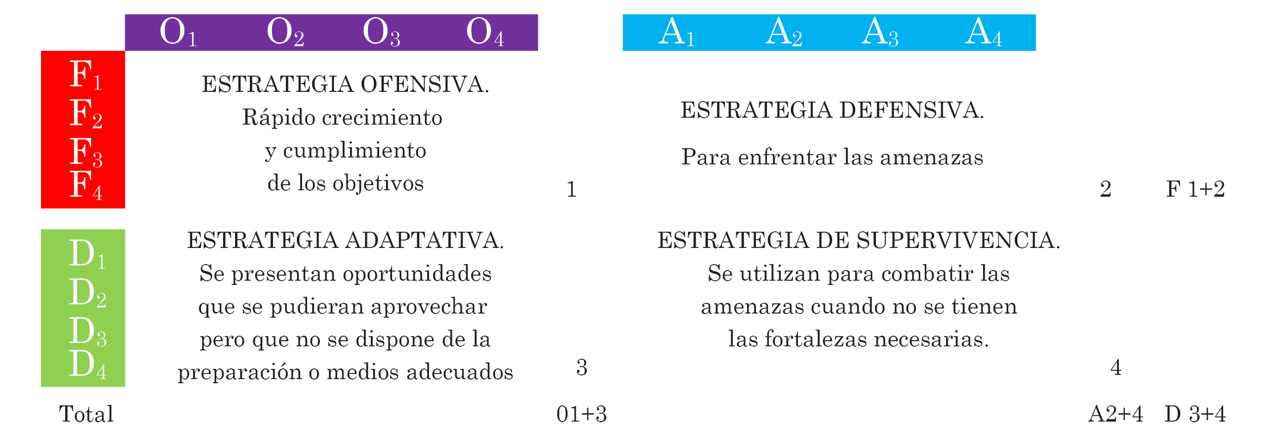 Estrategia de supervivencia (Debilidades – Amenazas): Aquellas navieras que presenten una estrategia de supervivencia se encuentran abocadas a la desaparición, debido a que no disponen de recursos suficientes para afrontar los nuevos retos de la industria. Así mismo, no serán considerados operadores aptos para realizar alianzas con ellos debido a que pueden disminuir la calidad prestada por los grandes opera-dores. Dichas navieras deberían fomentar la fusión o adquisición para no incurrir en la quiebra y pérdida de los accionistas.