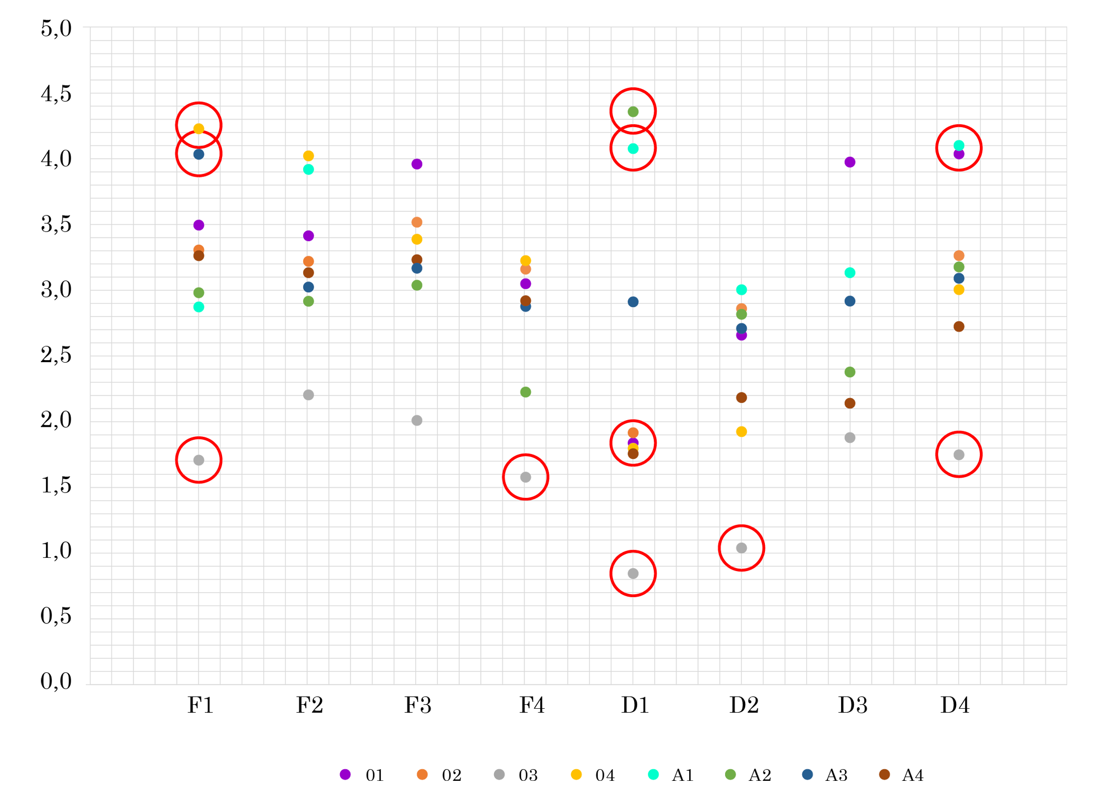 En la Fig 6 y Fig. 7 se muestran los valores medios obtenidos de las puntuaciones otorgadas por los expertos a las sesenta y cuatro relaciones planteadas. Identificando en ellas doce outliers que se describen a continuación.