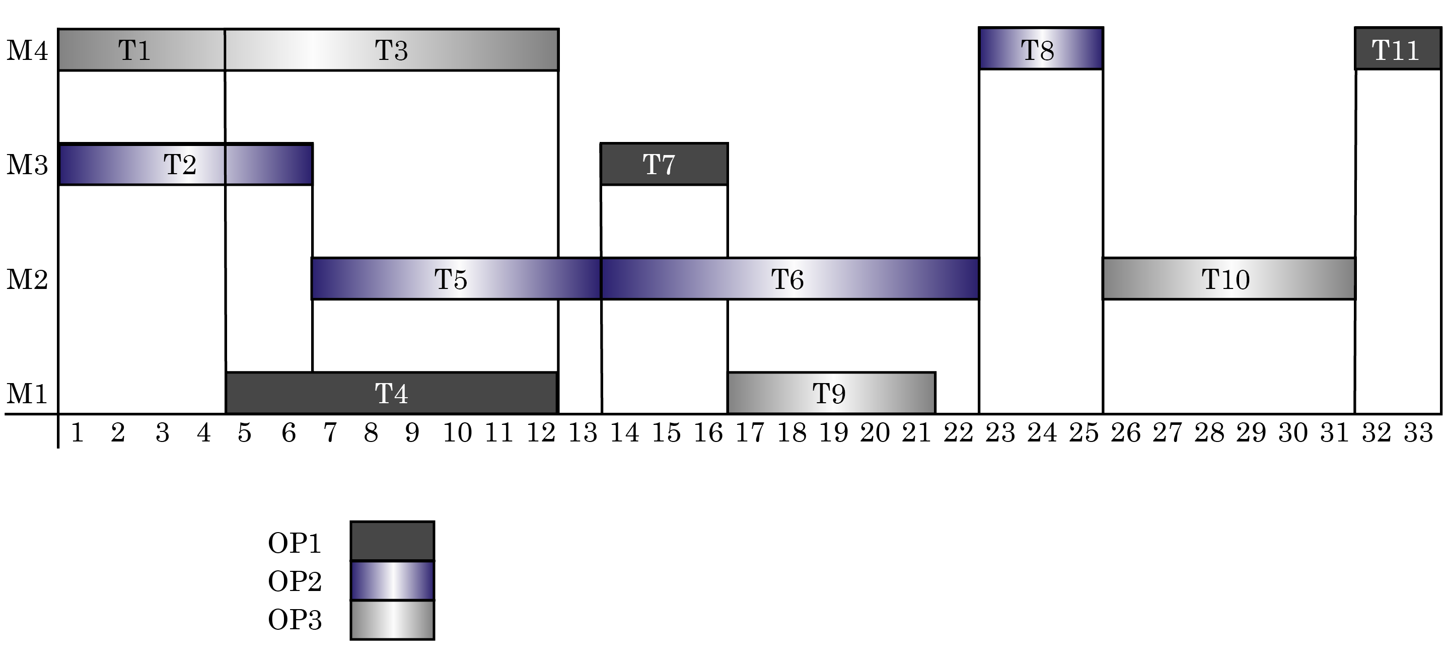 Se obtiene una solución óptima con makespan de 33, garantizando el cumplimiento de todas las restricciones. Es de anotar la forma como se asignan los trabajadores a las tareas; para el caso de las tareas 1 y 2, tanto el trabajador 1 como el 3 tienen la habilidad para realizarlas. Al asignar el trabajador 3 a la tarea 1, se debe asignar el trabajador 2 a la tarea 2, puesto que al no hacerlo; la tarea 2 debe esperar que el trabajador 3 termine la tarea 1 para así poder iniciar la tarea 2, caso que obligaría a que la programación se demore más, puesto que esta tarea iniciaría al finalizar la tarea 1 y no al inicio de la programación como se muestra en la Fig. 3.