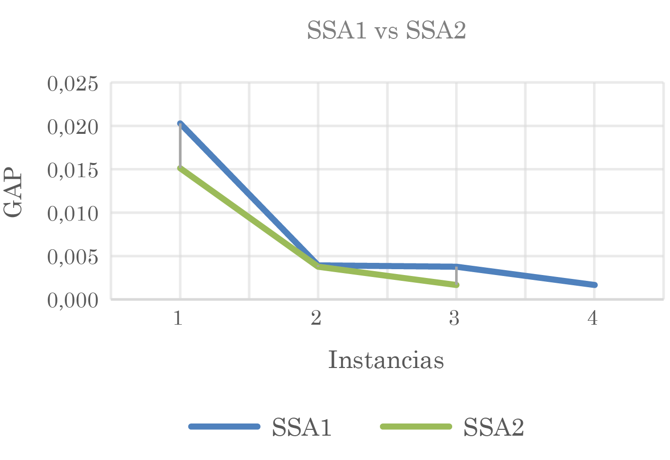 Por otra parte, es preciso analizar para aquellos problemas en donde no se alcanzaron soluciones óptimas, cual es la desviación de estas soluciones con respecto a las soluciones óptimas reportadas en la literatura. Como se puede apreciar en la Fig. 6, se pueden analizar los valores de esta desviación (Gap) para cada uno de los métodos propuestos. Para el método SSA1, se tiene que no se alcanzan soluciones óptimas en 4 instancias, los valores obtenidos presentan un gap de 0.0203, 0.0039, 0.0038 y 0.0017 respectivamente, lo que representan un gap promedio de 0.74%. Por su parte, el método SSA2 no alcanza soluciones óptimas en 3 instancias, los valores obtenidos presentan un gap de 0.0151, 0.0038 y 0.0017 respectivamente, lo que genera un gap promedio de 0.68%, por lo que se puede inferir que ambos métodos presentan un rendimiento aceptable al tener un gap promedio inferior al 1%.