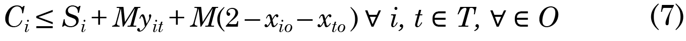 Las ecuaciones (1) y (2) garantizan que el Makespan sea mayor al tiempo de terminación de cada tarea programada, esto es, minimizar el Makespan. La ecuación (3) asegura que al iniciar cada tarea esta debe terminarse sin demoras. Las ecuaciones (4) y (5) describen que dos tareas consecutivas que se realizan en una misma máquina no se traslapen. Las ecuaciones (6) y (7) garantizan que un trabajador no pueda estar realizando dos tareas al mismo tiempo. La ecuación (8) asegura que se cumplan las relaciones de precedencia. La ecuación (9) describe que un trabajador no puede ejecutar una tarea sino tiene la habilidad para hacerlo. La ecuación (10) asegura que se asigne una tarea a un operador. Las ecuaciones (11) a (12) aseguran el dominio de las variables.