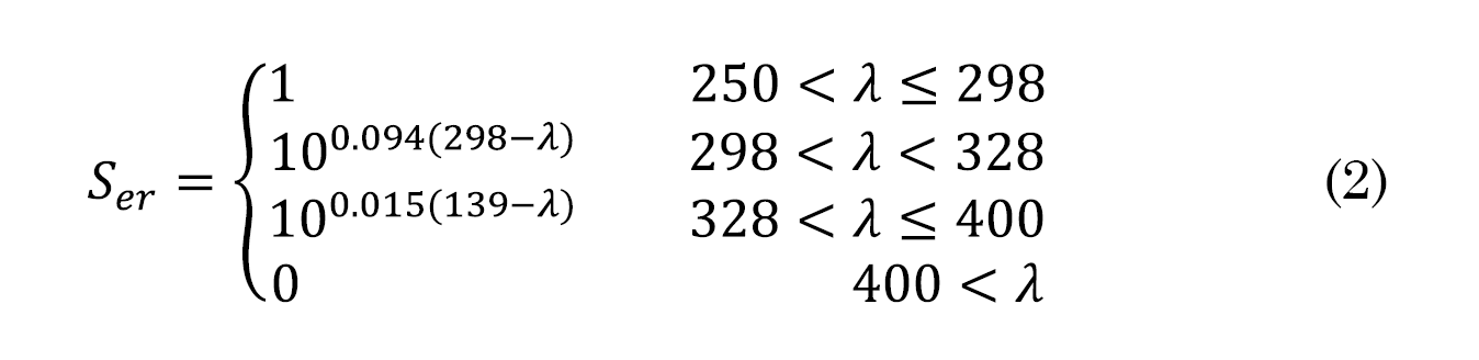 Donde Eλ es la radiación UV en [W/(m2 ∙ nm)], λ la longitud de onda UV y Ser (λ) el espectro de acción de referencia para el eritema a una longitud de onda λ y κer es una variable de peso equivalente a 40m2/W [8].