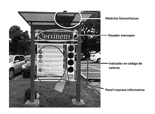 La Fig. 1 muestra el Solmáforo y sus partes, se ubican los módulos fotovoltaicos los cuales se encuentran en la parte superior de la estación y se encarga de alimentar energéticamente el sistema. También se distingue el pasador de mensaje que muestra además de un mensaje alusivo a la Universidad del Quindío, el IUV, la temperatura, la humedad y la hora. Seguidamente se muestra la IUV representada en código de colores y el panel impreso que indica que hacer ante las diferentes intensidades de radiación, cabe anotar que en la parte posterior del panel impreso también se encuentra información acerca de las medidas a tomar.