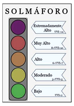 Bajo esta estandarización se relaciona diferentes rangos de magnitud IUV, con colores. La Fig. 2 muestra una forma didáctica de mostrar esta estandarización, por medio de un instrumento conocido como Solmáforo.