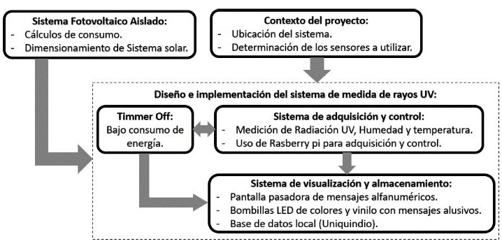 Metodología— En este aspecto se comenzó con el marco teórico relacionado con los rayos solares y la radiación UV, para luego implementar una estación de medición con acceso al público del campus universitario, generando mensajes informativos de precaución. Luego con la metodología Top Down se divide cada parte del proyecto en submódulos que genera una mejor búsqueda y asentamiento de los materiales y métodos a utilizar.