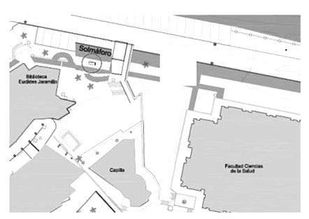 La Estación medidora de Radiación UV se encuentra ubicada en la Universidad del Quindío (Colombia), frente a la Biblioteca Euclides Jaramillo, la Fig. 5 muestra el mapa de la ubicación dentro del campus universitario. Es importante mencionar que al ubicar el sistema contiguo de la biblioteca, se tiene acceso a internet por medio de wifi en todo instante de tiempo, lo que permitió realizar aplicaciones en el concepto IoT.