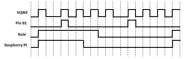 Apagar el Sistema de Adquisición y Control (manejado por una Rasp Berry Pi 2, Rpi) con el relé puede afectar el funcionamiento de este o incluso bloquearlo, es por eso por lo que con el Timer Off se decide generar un pulso de 10 ms, 5 segundos antes de cerrar el relé, con el fin que se detecte el pulso e inmediatamente inicie el apagado de forma segura. En la Fig. 6 se observa un diagrama de tiempo de las señales que intervienen en el funcionamiento del Timer Off. La señal SQWE corresponde al pulso generado por el DS1307 de 1 Hz, la señal Pin B1 corresponde a el pulso de 10 que envía el Timer Off a la Rpi para el apagado seguro, como se puede observar la Rpi se apaga antes de que se apague el relé.