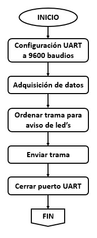Para la implementación en Python se usó el módulo Serial, el cual ya viene por defecto instalado en la Rpi. El canal UART se configuró para comunicarse con el aviso a 9600 baudios. En la Fig. 9 se observa el diagrama de flujo para enviar un dato al aviso de LED y en la Fig. 10 se muestra el diagrama funcional de todo el sistema y como se acopla los diferentes módulos de este.