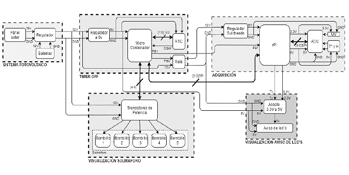 Para el diseño e implementación de la estación, se forma un diagrama de bloques desglosado en 4 módulos, los cuales se muestran en la Fig. 4. El primero suple el suministro energético mediante el Sistema Fotovoltaico aislado; el segundo Timer Off o control de encendido y apagado; el tercero sistema de adquisición y control; y por último el sistema de visualización y almacenamiento.