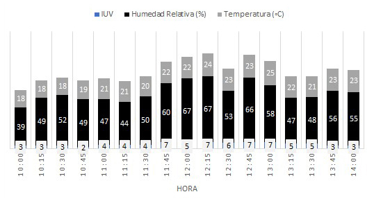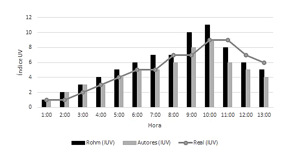 Para el cálculo del IUV, en el mes de noviembre del 2018 se realizaron mediciones durante dos semanas desde las 8 a.m. hasta las 4 p.m., donde se detalla que entre las 10 a.m. y las 2 p.m., se presenta los mayores valores de IUV durante el día debido al alto ángulo solar respecto a la zona, que provoca la penetración de más rayos UV en la tierra, como se muestra en Fig. 12.