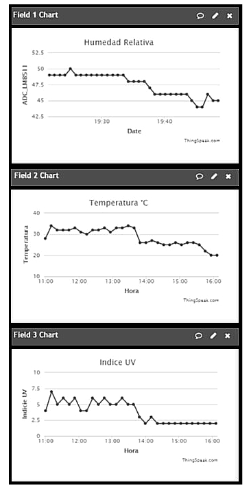 Conclusions— Building the ultraviolet measurement satiation energized by a photovoltaic system accomplishes the goal of people sensitizing about how dangerous the prolonged exposition of UV rays and the recommendations is they must follow to avoid these issues. On the other hand, system applies current methods about energy consumption like Timer off technique and renewable energy when using solar panel to store solar radiation energy, turning this system into an autonomous measurement system, in addition, it makes use of the IoT concept in the development of web platforms and the use of wireless communication systems.